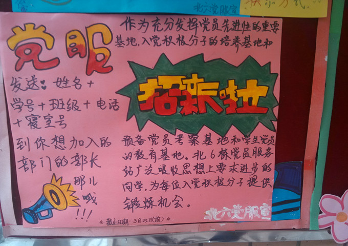 2015年3月16日,北六党员服务站为了给北六的同学们参加服务活动锻炼能力提供一个良好的平台和机会,并为服务站注入新的血液,特在新学期开始新一轮招新。