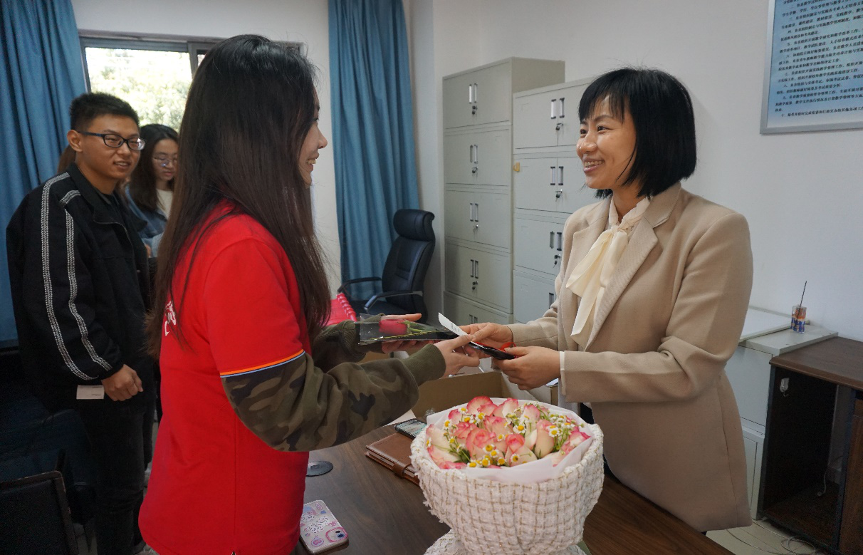 (图为党服站员为学院领导和老师们送上鲜花与祝福,张子璇摄)