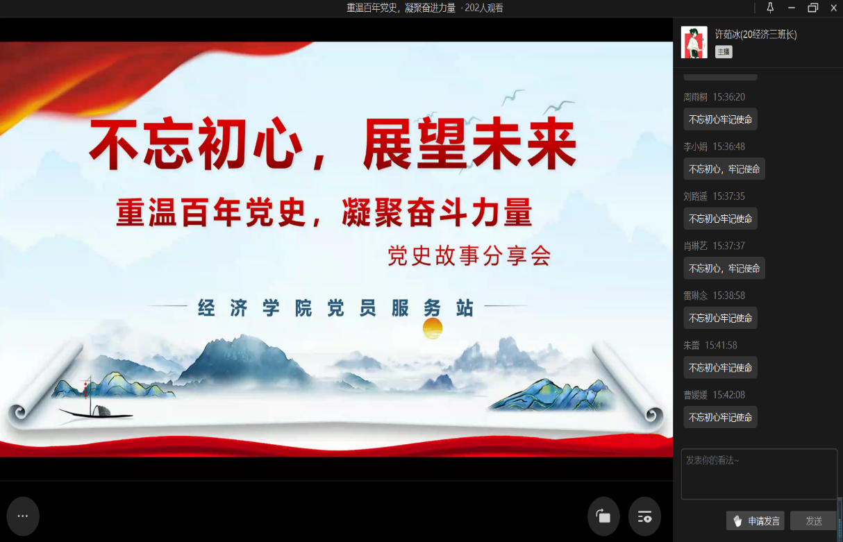 “了解历史才能看得远,理解历史才能走得远。”回望过往的奋斗路,事实证明只有学好党史、总结经验,才不会在前进的道路上迷失方向,才能走得更远更长。为了帮助站员们更好地学习党史知识,进一步巩固党史学习的成果,4月1日公司党员服务站通过线上直播的形式举办了“重温百年党史,凝聚奋进力量——不忘初心,展望未来”党史故事分享会。研究生与本科生,共200位站员参与了活动。本次活动的主持人由20级经济学三班的许茹冰担任。