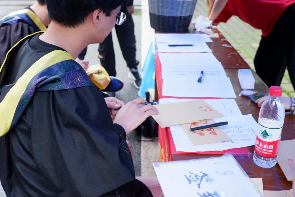 文字不仅仅是记录信息的媒介,更是承载情感与故事的最佳方式。通过信件的形式,站员们用朴实无华的文字记录下了老员工活的点点滴滴,回忆了求学路上的绚烂风景,同时传达了自己对美好未来的憧憬。活动开始前,工作人员在博智楼前的空地布置好帐篷,并为参加活动的同学准备了党服特制的精美礼品。下午两点左右,站员们陆续前往指定地点,并将亲手书写的信件投入到信箱之中。本次活动涵盖面积广,影响范围大,除了报名本次活动的站员,其他学院的员工也积极参与其中。在活动过程中,一些身着学士服的毕业生也将未来的憧憬和对学弟学妹们的寄语留在了活动提供的信纸上,将那一份温暖与希望投递到了现场的信箱当中。随着活动的进行,信箱逐渐填满。尽管站员们的信纸信封不同,字迹字体各异,但每一封信都饱含着站员们同样真挚的情感,每一条寄语都承载着18级毕业生们对未来的无尽期许,传递着人与人之间最真挚的情感。