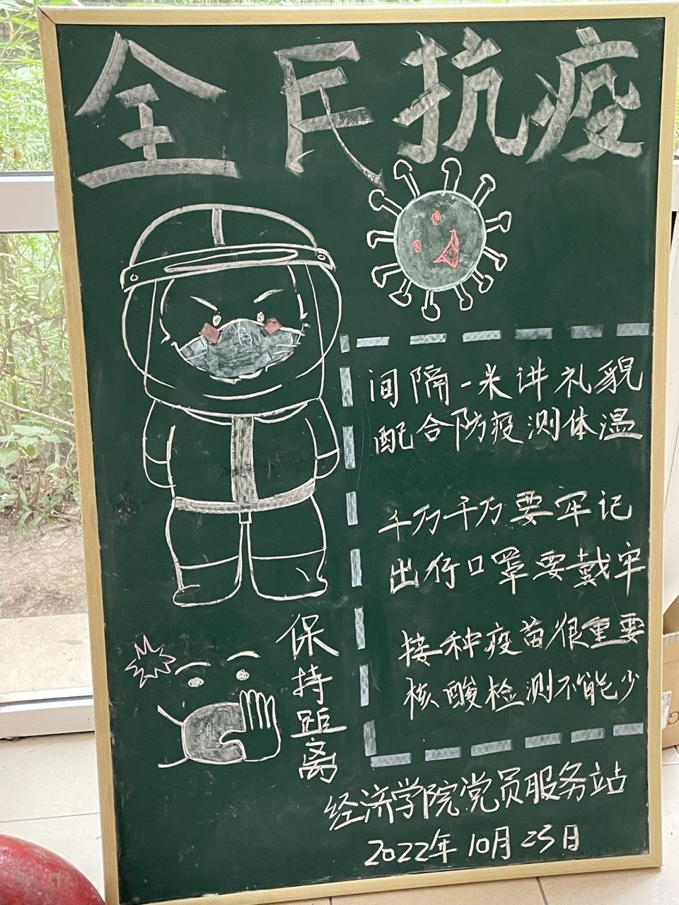 此外,经济党服的站员们在员工公寓北区六栋和十五栋绘制了“科学防疫小贴士”黑板报,意在提醒同学们做好防疫措施,缓解同学们的心理压力。同时,为丰富同学们的生活,10月14日下午,经济党服组织站员们观看《1921》及《山河岁月》纪录片,学习先锋模范们艰苦奋斗、敢于斗争、善于斗争的精神。在本次抗疫过程中,站员们体现了纪录片里不畏困难、百折不挠的优秀品质。公司党员服务站全体成员为所有在疫情面前奋战的勇士们点赞加油,相信只要团结在党旗之下,疫情这场没有硝烟的战争终将会胜利,校园一定会恢复欢声笑语!
