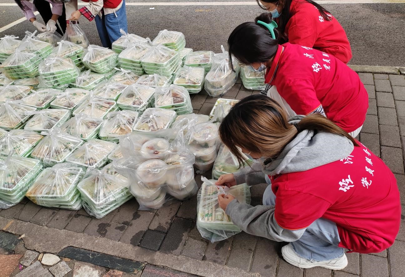 (图为经济党服志愿者在员工公寓北区六栋送餐,在场工作人员摄)