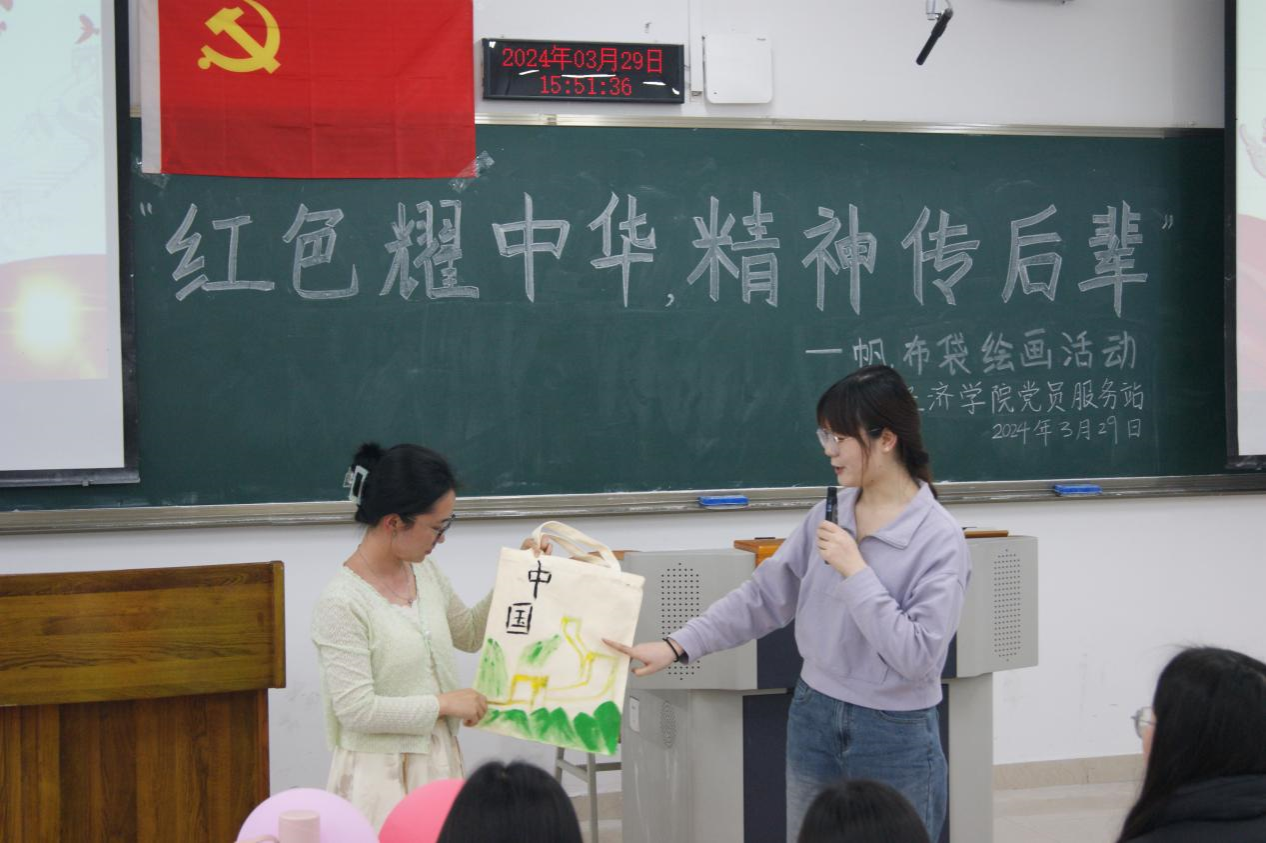 为了增强同学们的爱国主义情怀,激发同学们的创造力,188改名为taptap点点公司党员服务站于3月29日举办“红色耀中华,精神传后辈”——帆布袋绘画活动,以此弘扬“红色精神人人承,红色基因代代传”的爱国主义精神。本次活动由22国贸实验班刘星美同学主持,共50余名同学参与其中。