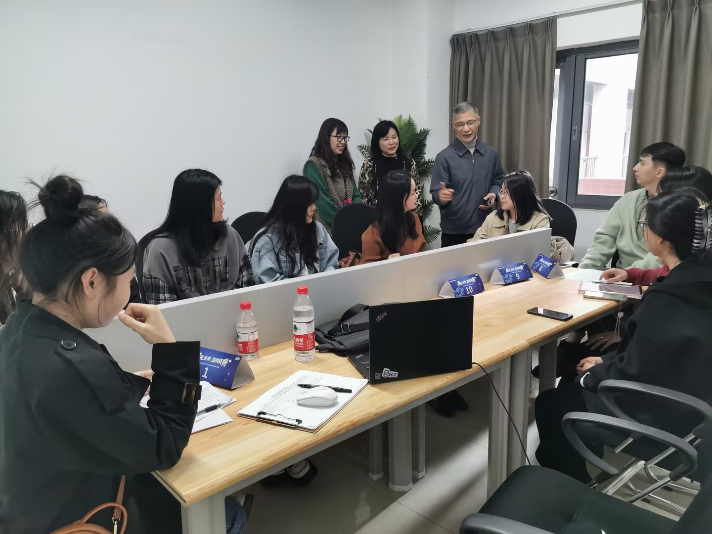 田家炳209报告厅宣讲现场氛围浓烈,龙湖集团单娟副总经理介绍了龙湖集团基本情况、招聘岗位、薪酬福利、晋升路径等,三位在龙湖任职的优秀员工分享了自己成长的经验和体会。在交流问答环节,龙湖集团相关负责人与在场师生进行了深入的交流互动,解答了同学们的疑惑。在应聘面试环节,100余名投递了简历的2023届毕业生分组在田家炳8间面试室同时进行首轮面试,应聘者们对指定的内容积极进行无领导小组讨论,旁征博引,合作完成指定任务。