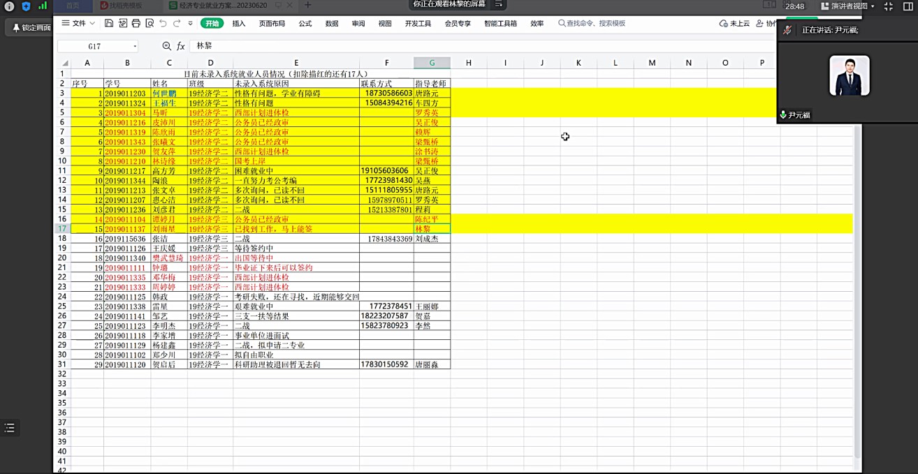 首先,林黎就系里毕业生的就业情况和最新的就业信息给各位老师进行了详细的讲解和分析,并邀请了资深辅导员杨华俊老师分享促进毕业生就业的经验。随后,林黎就未就业员工名单,与员工的指导老师进行了点对点的分析,针对当前未就业的毕业生的就业情况、家庭状况、心理状况和自身能力进行了全面的分析和讨论,提出对应促就业的对策和建议。林黎指出,一定要及时跟进考编考研上岸人员的就业信息情况,一旦有新的变动要做到第一时间录入信息。对就业有心理抵触的同学,要做足做好沟通工作,时时刻刻体现“以生为本”。