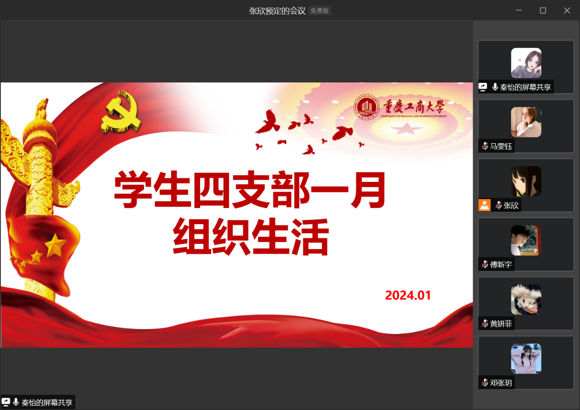 会议正式开始,首先,进行会议第一项议程,由主持人介绍组织生活主题,本次组织生活的主题为“凝心聚力再出发,砥砺前行新征程”。其次,党员吉雅欣围绕“习近平在纪念毛泽东同志诞辰130周年座谈会上的讲话”进行学习分享,借助视频和深度领学,毛泽东伟人形象更鲜活地呈现在同志们眼前,加深了大家对革命先辈精神的理解与领悟。随后,党员冯琼玲针对 “国家主席习近平二〇二四年新年贺词”进行展开交流,带领大家回顾了2023年来中国在各领域迈出的坚实步伐。接着,党员邓张玥则以“习近平在接见参加2023年度驻外使节工作会议的全体使节时的重要讲话精神”为主题进行分享,并采用提问互动方式,加深了大家的学习成果。学习分享结束后,支部书记文理就本次专题组织生活进行总结发言,充分肯定了本次组织生活的重要意义,同时期待组织生活的形式能继续守正创新,希望各位同志能度过一个充实的寒假。