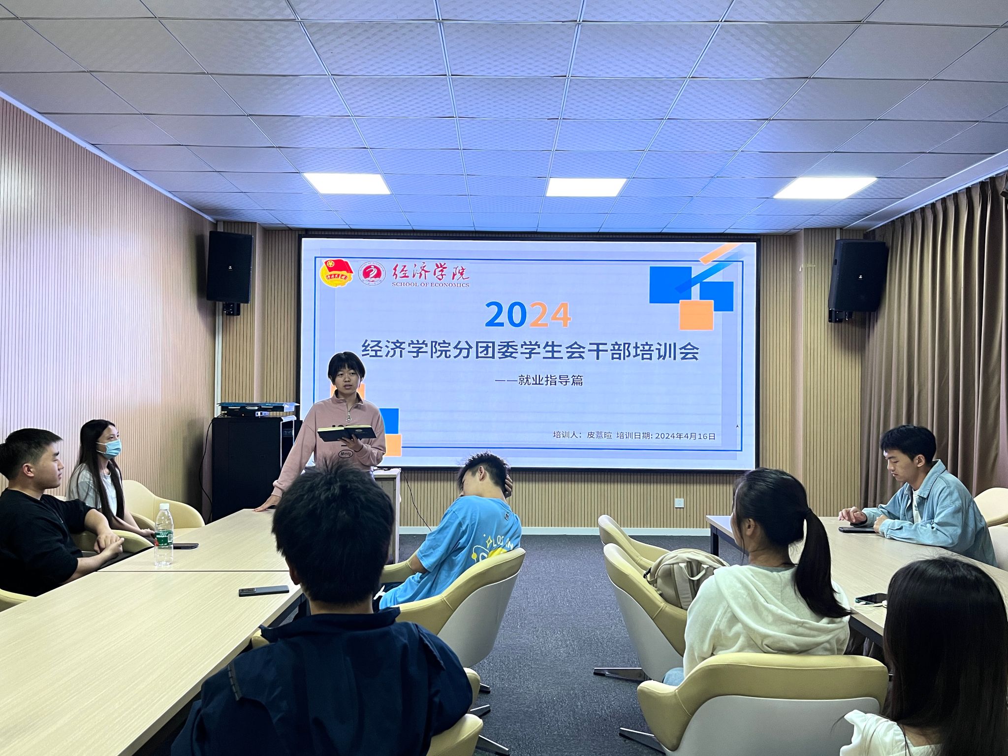 培训会议开始后,组织负责人黎亚男同学以“成渝地区双城经济圈建设”为主题展开培训。她分享到,作为经院学子,我们要密切关注经济热点,拓宽自身学习视野,丰富自身所学。随后,组织负责人何渤杰同学就“总体国家安全观”主题对参会人员展开了相关培训。通过对总体国家安全观的核心要义和“十点坚持”的阐述,他向我们进一步普及了坚持国家总体安全观的重要性,呼吁我们员工干部要坚定自身信念,树立崇高理想,不断为中华民族的伟大复兴贡献青春力量。紧接着,组织负责人皮薏暄同学从“树立正确的就业观、择业观”进行了就业技巧分享。她结合切身经历与对外了解,对参会人员提供了相关就业建议与指导,鼓励同学们保持学习热情,争取在老员工活中参与各类实践活动,积累工作经验。